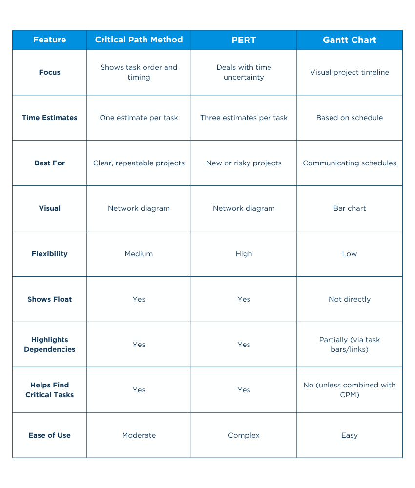Here’s a simple comparison of the Critical Path Method vs PERT vs Gantt Charts: