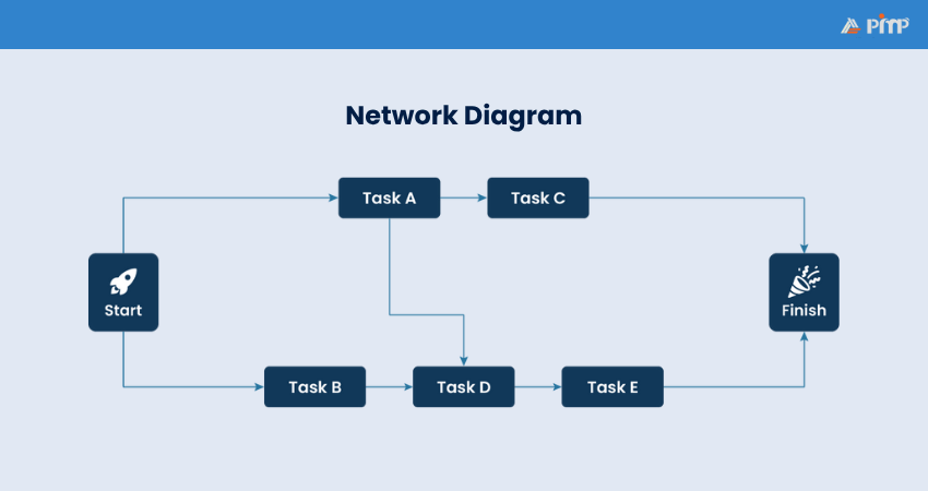 A network diagram, also known as a project logic diagram, is a visual map of the sequence of tasks and their dependencies. Each task is shown as a box (node), and arrows between them show dependencies. There are two common types of diagrams: