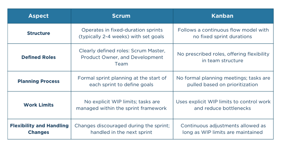 Scrum uses clearly defined roles, including the Scrum Master and Product Owner, which provide structure and accountability. Kanban does not require fixed roles, allowing teams to keep existing responsibilities and adapt roles naturally as work evolves.