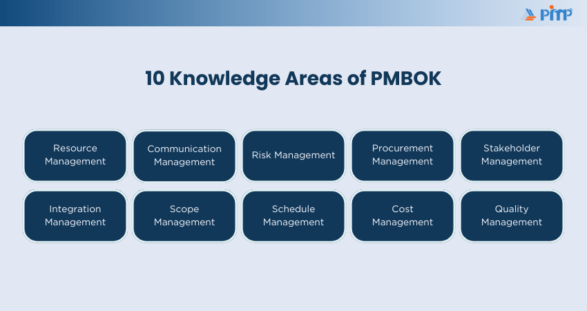 PMBOK outlines 10 knowledge areas, each representing an important aspect of Project Management. These are applied across the five process groups. Here are those knowledge areas: