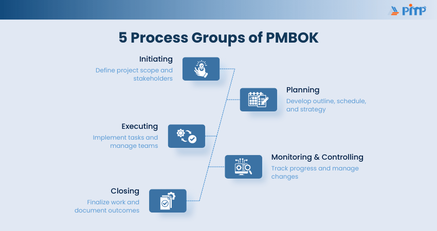 PMBOK divides the project activities into five main stages, known as process groups. These stages are not sequential but often overlap and work together during the project lifecycle. Here are those five process groups: